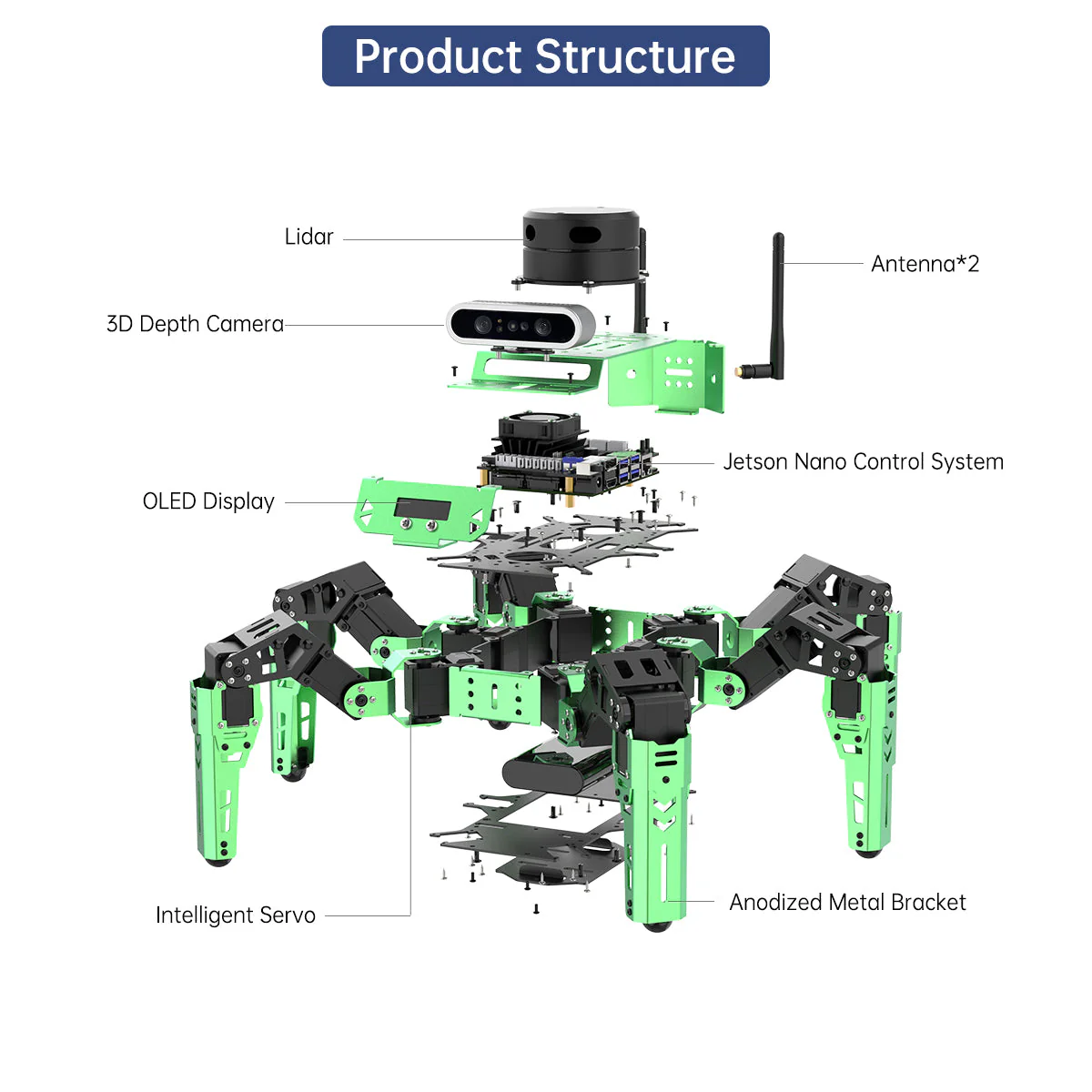 JetHexa is a hexapod robot powered by NVIDIA Jetson Nano and supports Robot Operating System (ROS). It leverages mainstream deep learning frameworks, uses OpenCV for image processing, incorporates MediaPipe development, enables YOLO model training, and utilizes TensorRT acceleration.