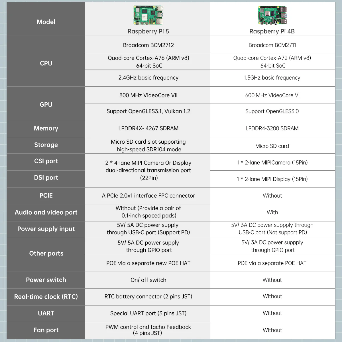 Pi 4B 4GB, Pi 4B 8GB, Pi 5 4GB, Pi 5 8GB