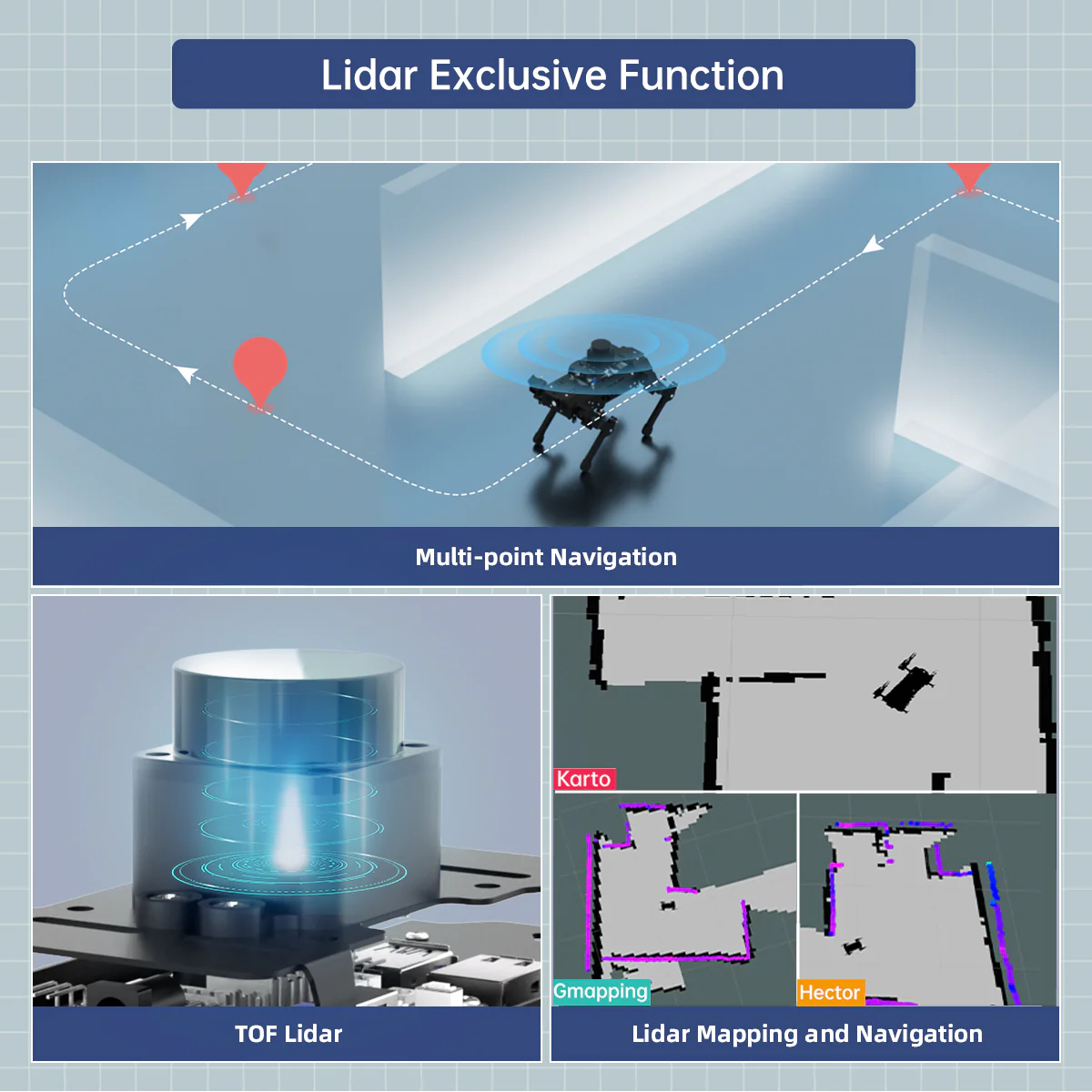 • 【Lidar & Robotic Arm Expansion】 PuppyPi quadruped robot supports TOF Lidar and robotic arm expansion. It can perform 360° environmental scanning, SLAM navigation, and dynamic obstacle avoidance. Additionally, Hiwonder PuppyPi can precisely grasp objects, opening up opportunities for advanced AI applications.