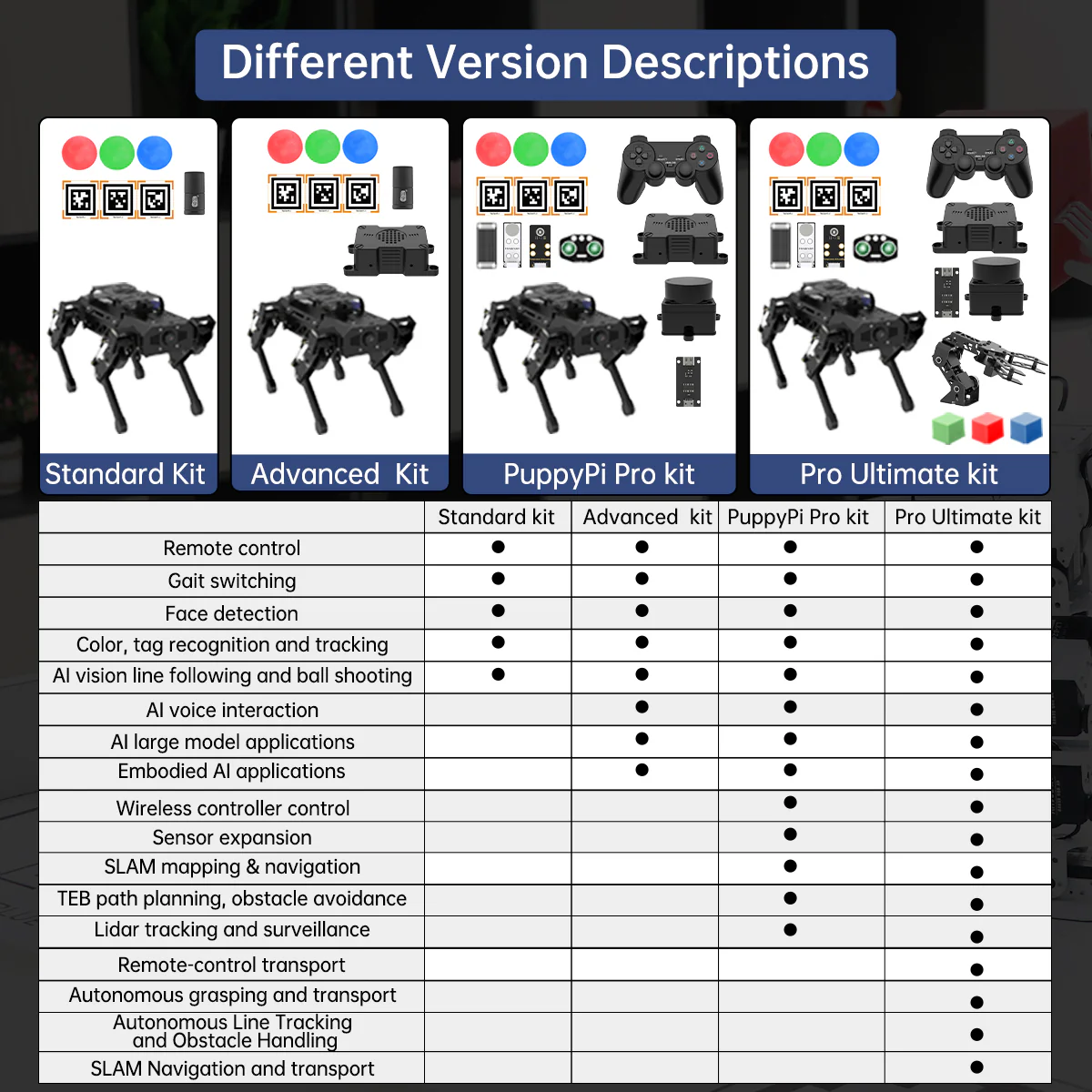 • 【Raspberry Pi 5 & ROS1/ROS2 Compatible】PuppyPi is an AI vision robot dog built for education and development. Powered by a Raspberry Pi 5 and fully compatible with ROS1 and ROS2, it enables efficient AI computing and versatile robotics projects through Python. Complete source code and documentation included to help you build and customize your own intelligent robot dog.