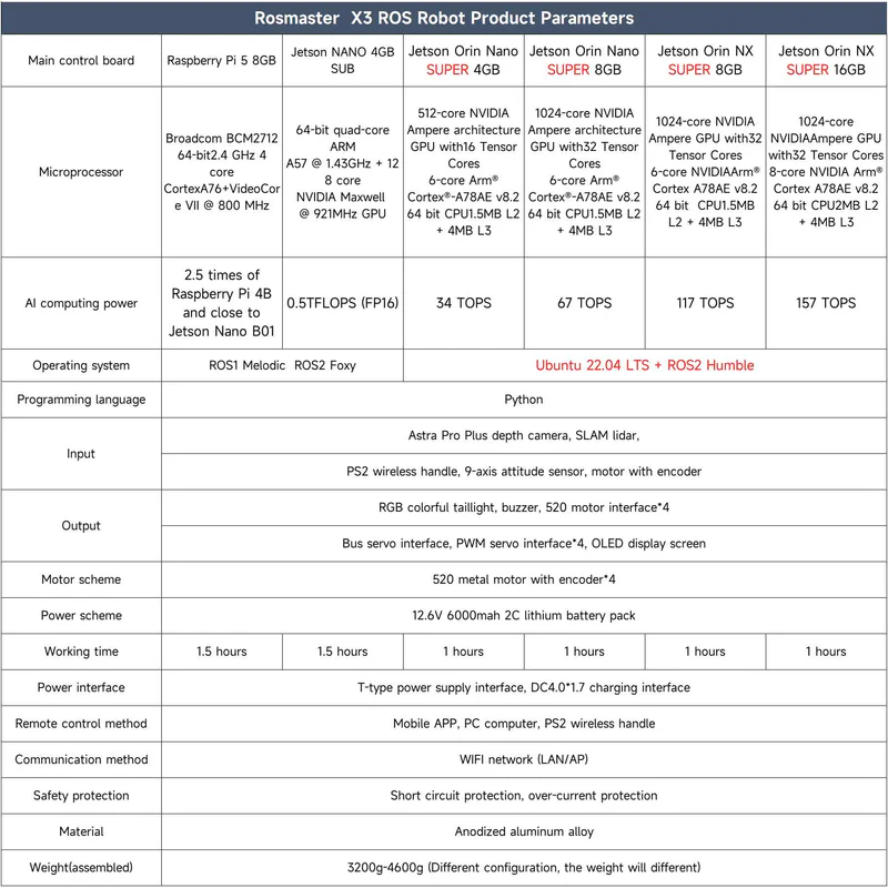 ROSMASTER X3 is an educational AI voice interaction robot based on the robot operating system with Mecanum Wheel, compatible with Jetson NANO/Orin NX SUPER/Orin NANO SUPER and Raspberry Pi 5.