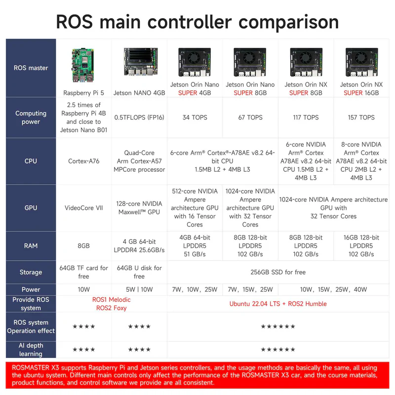 3) Four controllers are available, Jetson NANO, Jeston Orin NX SUPER, Jeston Orin NANO SUPER and Raspberry Pi 5.