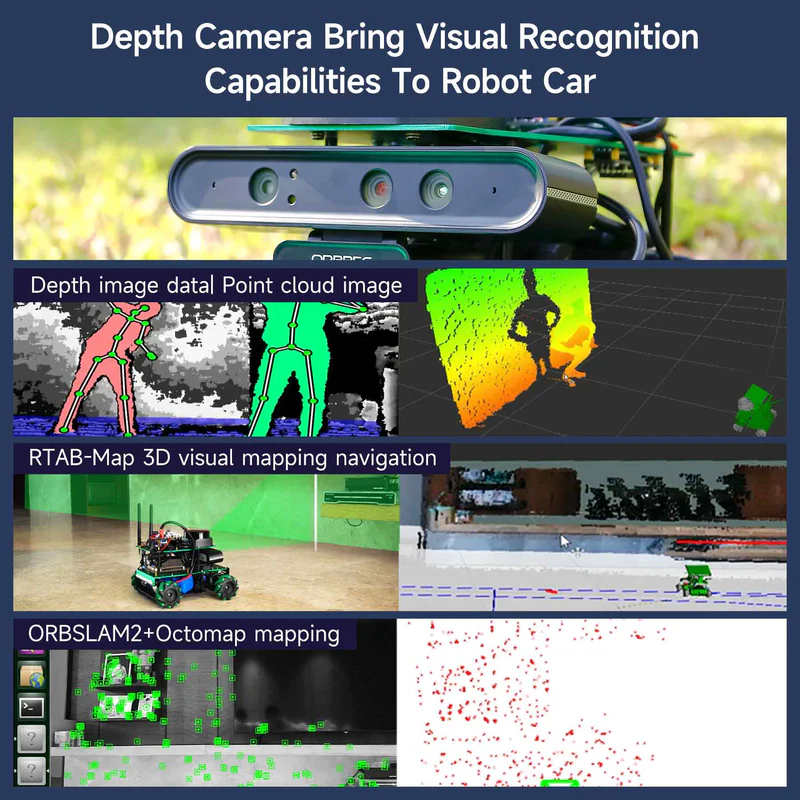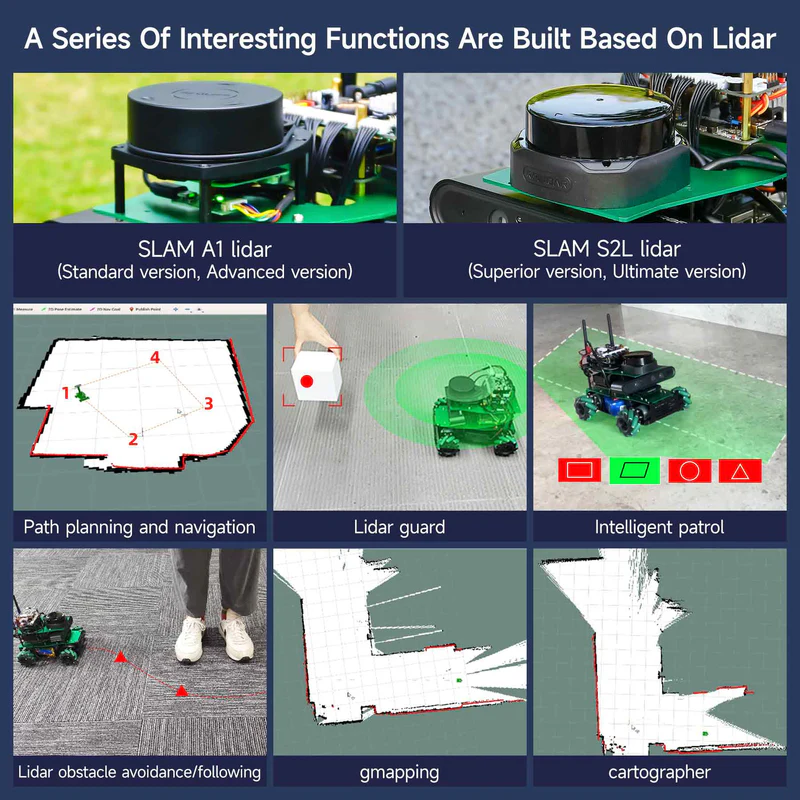 LiDAR supports algorithm mapping, DWA path planning and navigation, obstacle avoidance, depth camera supports RTAB-Map 3D